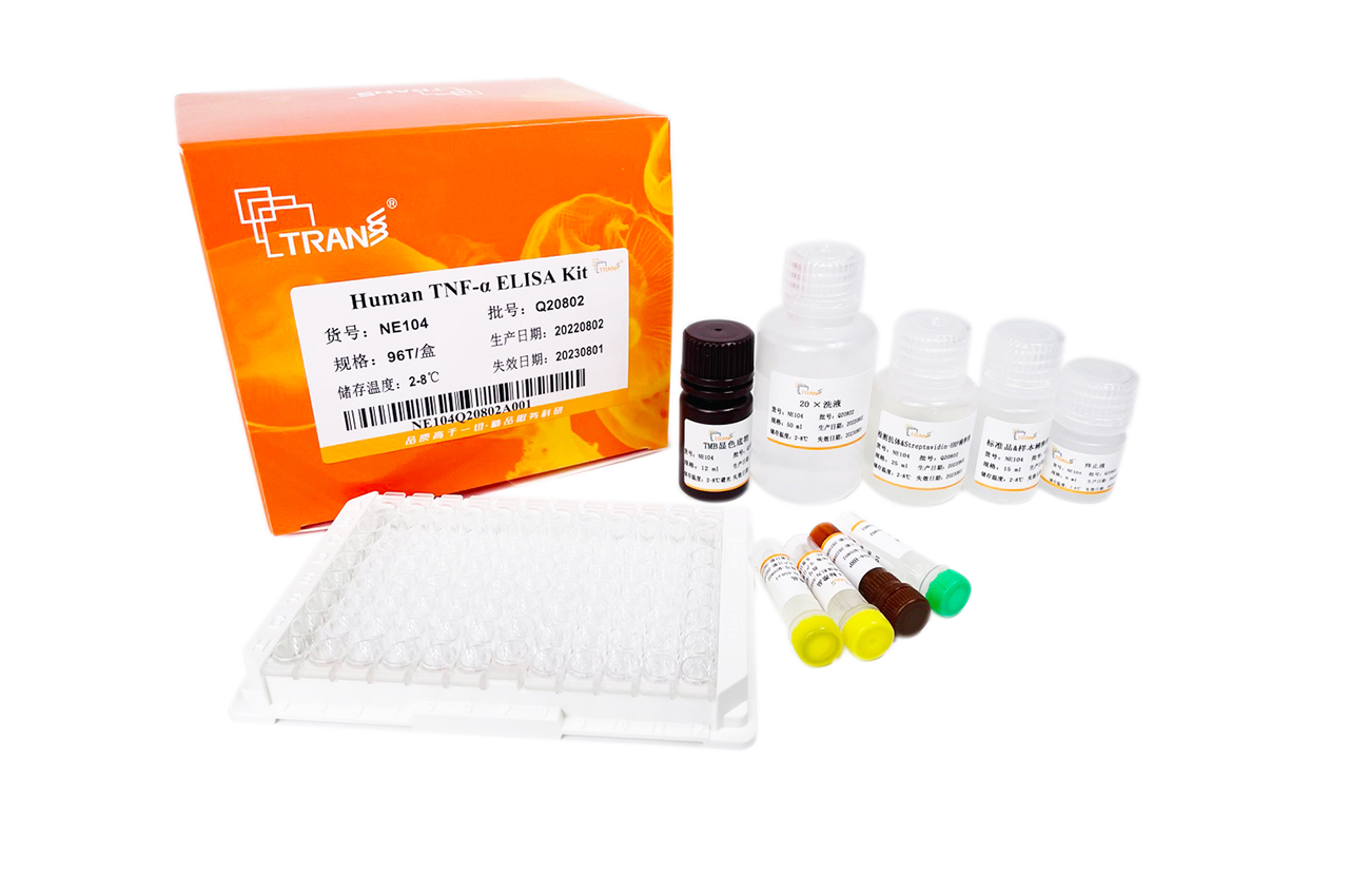 本試劑盒采用雙抗體夾心ELISA法定量測定人血清、血漿和細(xì)胞培養(yǎng)上清中的TNF-α含量。本試劑盒采用高親和力的抗人TNF-α抗體預(yù)包被酶標(biāo)板,將標(biāo)準(zhǔn)品/待測樣本加入微板孔中,經(jīng)過孵育后樣本中存在的TNF-α?xí)c酶標(biāo)板上的預(yù)包被抗體特異性結(jié)合。洗滌去除未結(jié)合物后,將生物素標(biāo)記的抗人TNF-α檢測抗體加入微板孔中,再次孵育后檢測抗體會與錨定在酶標(biāo)板上的TNF-α特異性結(jié)合。隨后,將辣根過氧化物酶標(biāo)記的鏈霉親和素(Streptavidin-HRP)加至微孔板中并孵育,通過檢測抗體上的生物素和鏈霉親和素發(fā)生的高強度非共價結(jié)合,形成“包被抗體-人TNF-α蛋白-檢測抗體-Streptavidin-HRP”免疫復(fù)合物。再次洗滌后,將顯色底物TMB加至微板孔中,HRP會催化TMB底物生成藍色產(chǎn)物,顏色反應(yīng)的深淺將與樣本中TNF-α的濃度成正相關(guān)。而后加入終止液終止反應(yīng),在450 nm波長(參考波長570 - 630 nm)處測定吸光度值。通過繪制標(biāo)準(zhǔn)曲線,由樣本吸光度值可計算出樣本中所含TNF-α濃度。本試劑盒特異性強、檢測靈敏度高,同時操作更加便捷。