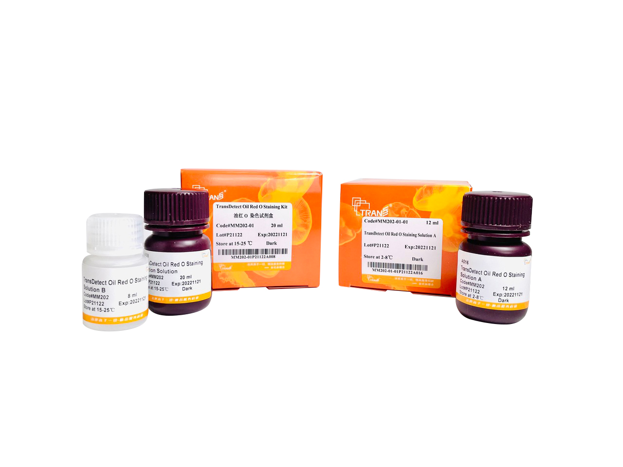 油紅O (Oil Red O) 屬于偶氮染料,是很強(qiáng)的脂溶劑和染脂劑,在脂質(zhì)內(nèi)能高度溶解,可特異性地與細(xì)胞或組織中的甘油三酯結(jié)合呈小脂滴狀。其原理是油紅O在脂類中的溶解度比在溶劑中大,當(dāng)進(jìn)行細(xì)胞或組織染色時(shí),染料離開有機(jī)溶劑而溶于細(xì)胞或組織內(nèi)的脂質(zhì) (如脂滴) 中,從而使細(xì)胞內(nèi)的脂滴呈橘紅色至紅色 (具體顏色因脂質(zhì)濃度而定) 。該產(chǎn)品適用于脂肪細(xì)胞的染色,也可配合TransDiffer? Human Mesenchymal Stromal Cell Adipogenic Differentiation Medium (TransGen, Cat.MM201) 進(jìn)行人間充質(zhì)干細(xì)胞成脂分化能力檢測(cè)。