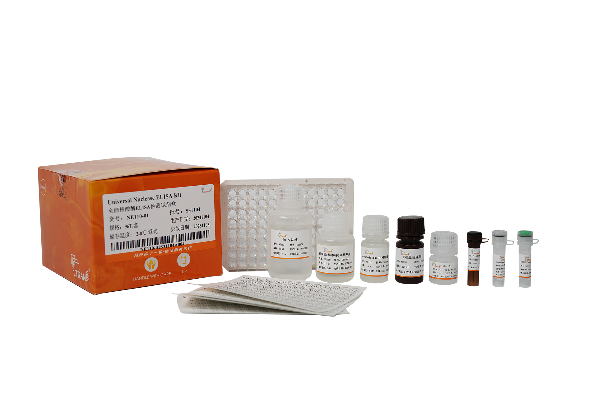 本試劑盒采用雙抗體夾心ELISA法定量測定生物制品中Universal Nuclease的殘留量。本試劑盒采用高親和力的Universal Nuclease抗體預(yù)包被酶標板,將標準品/待測樣本和生物素標記的抗Universal Nuclease檢測抗體同步加入微板孔中,經(jīng)過孵育后樣本中存在的Universal Nuclease會與酶標板上的預(yù)包被抗體及檢測抗體特異性結(jié)合。洗滌去除未結(jié)合物后,將辣根過氧化物酶標記的鏈霉親和素(Streptavidin-HRP)加至微孔板中并孵育,通過檢測抗體上的生物素和鏈霉親和素發(fā)生的高強度非共價結(jié)合,形成“包被抗體- Universal Nuclease蛋白-檢測抗體-Streptavidin-HRP”免疫復(fù)合物。再次洗滌后,將顯色底物TMB加至微板孔中,HRP會催化TMB底物生成藍色產(chǎn)物,顏色反應(yīng)的深淺將與樣本中Universal Nuclease的濃度成正相關(guān)。而后加入終止液終止反應(yīng),在450 nm波長(參考波長570 - 630 nm)處測定吸光度值。通過繪制標準曲線,由樣本吸光度值可計算出樣本中所含Universal Nuclease濃度。本試劑盒特異性強、檢測靈敏度高,同時操作更加便捷。