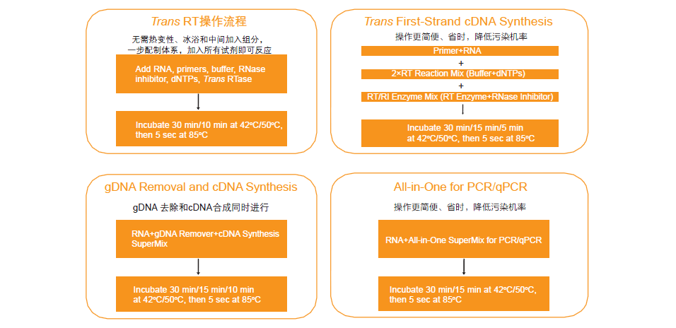 本產品以RNA為模板,在同一反應體系中,合成第一鏈cDNA的同時去除RNA模板中殘留的基因組DNA。反應結束后,只需在85℃加熱5秒鐘,即可同時失活TranScript? RT/RI與gDNA Remover。
