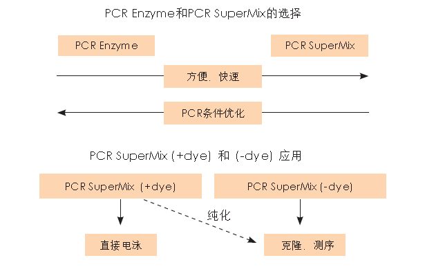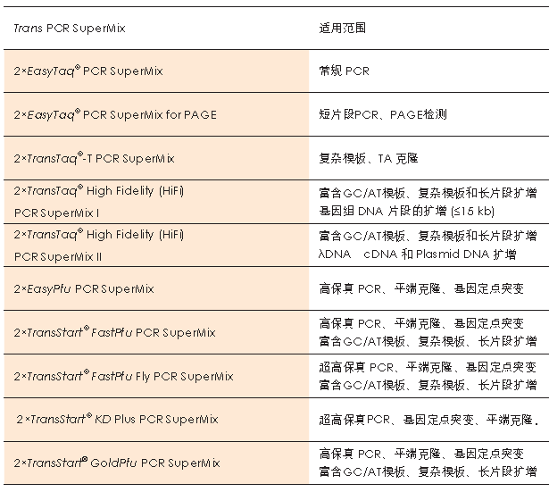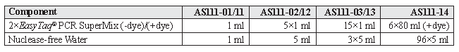本產(chǎn)品包含EasyTaq? DNA Polymerase、dNTPs和優(yōu)化的反應(yīng)緩沖液,濃度為2×。DNA擴(kuò)增時(shí),只需加入模板、引物和水,使SuperMix溶液的濃度為1×即可進(jìn)行反應(yīng)。擴(kuò)增產(chǎn)物3' 端帶“A”堿基,2×EasyTaq? PCR SuperMix (-dye) 擴(kuò)增產(chǎn)物可直接克隆于pEASY?-T系列載體中;2×EasyTaq? PCR SuperMix (+dye) 擴(kuò)增產(chǎn)物可直接點(diǎn)樣電泳,如用于克隆,需純化去掉染料。其PCR產(chǎn)物不適用于聚丙烯酰胺凝膠電泳。