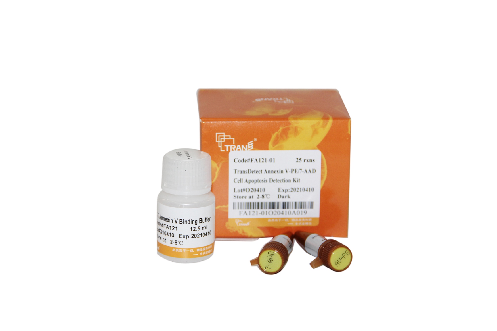 7-AAD是一種核酸染料,它不能透過具備完整細(xì)胞膜的正常細(xì)胞和早期凋亡細(xì)胞,但能夠透過凋亡中晚期的細(xì)胞和壞死細(xì)胞的細(xì)胞膜而將細(xì)胞核染色,可被488 nm激發(fā),最大發(fā)射波長在647 nm。將 Annexin V-PE與7-AAD 匹配使用,就可以區(qū)分處于不同凋亡時期的細(xì)胞。本試劑盒操作簡便、靈敏度高、特異性強(qiáng),適用于早期凋亡細(xì)胞的檢測。