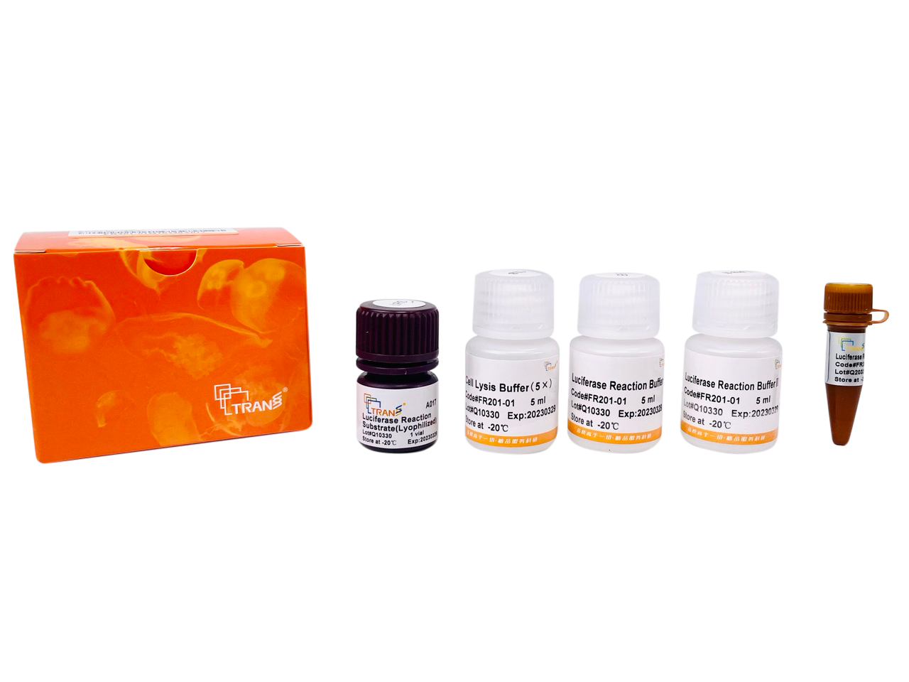 螢火蟲熒光素酶 (firefly luciferase)和海腎螢光素酶(Renilla luciferase)可分別催化熒光素 (luciferin)或腔腸素 (coelenterazine) 氧化形成oxyluciferin或coelenteramide ,并在此過程中產(chǎn)生生物熒光。TransDetect? Double-Luciferase Reporter Assay Kit首先以熒光素為底物檢測螢火蟲熒光素酶報告基因的活性,之后在淬滅該熒光反應的同時,以腔腸素為底物檢測海腎熒光素酶報告基因的活性,具有檢測迅速、靈敏度高、檢測范圍廣、無細胞內(nèi)源活性干擾等特點。